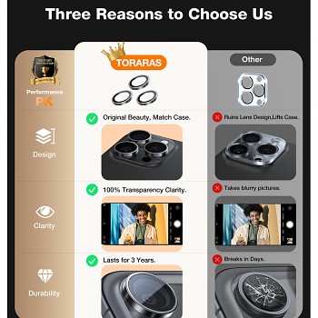 Ochrana kamery Torras Lensguard se vyznačuje minimalistickým a precizním designem, který respektuje původní vzhled vašeho iPhonu. Každý objektiv je chráněn samostatným kroužkem v elegantní titanově šedé barvě, která ladí s rámem telefonu. Díky tomu ochrana nepřidává zbytečný objem a zachovává originální krásu zařízení. Použité materiály, včetně leteckého skla, zajišťují, že vaše objektivy budou v bezpečí před poškrábáním, prachem a nárazy, aniž by to ovlivnilo optický výkon.