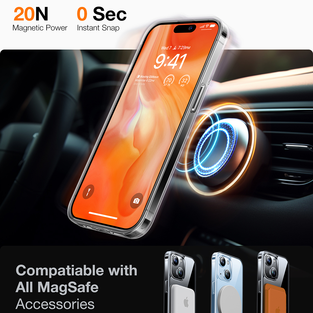 Pouzdro Torras Ostand MagSafe Series pro iPhone 15 se pyšní minimalistickým a funkčním designem. Je zcela průhledné, což umožňuje plně vyniknout originální estetice vašeho telefonu. Na zadní straně je elegantně integrován stříbrný magnetický kroužek, který slouží nejen pro MagSafe kompatibilitu, ale také jako praktický výklopný stojánek. Tento kroužek je diskrétně složen, když není potřeba, a po vyklopení poskytuje stabilní oporu. Okraje pouzdra jsou mírně zvýšené a zpevněné, což dodává telefonu dodatečnou ochranu, aniž by narušovalo jeho štíhlý profil. Celkový vzhled je čistý, moderní a podtrhuje prémiový charakter iPhone 15.