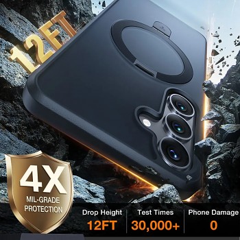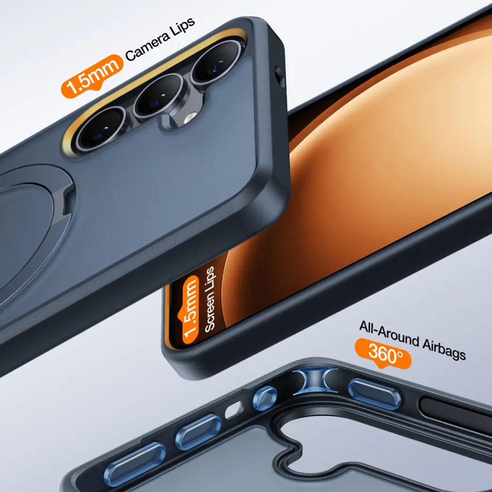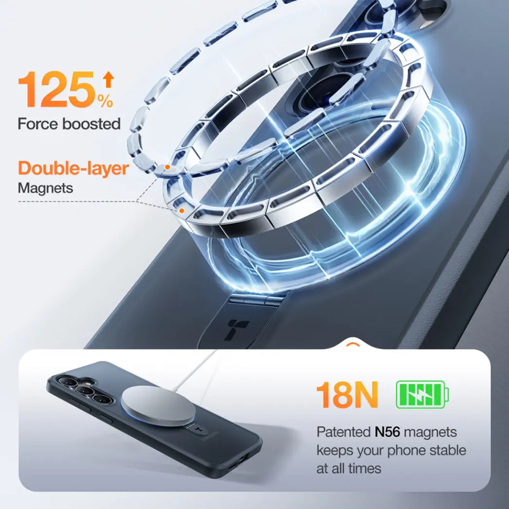 Kryt Torras Ostand MagSafe Series se pyšní elegantním a funkčním designem. Zadní strana krytu je vyrobena z poloprůhledného tmavě šedého materiálu, který decentně odhaluje logo Samsung, zatímco okraje jsou v matné černé barvě. Klíčovým prvkem je integrovaný MagSafe kroužek, který zajišťuje plnou kompatibilitu s MagSafe příslušenstvím a nabízí o 125 % silnější magnetické spojení díky dvouvrstvým patentovaným magnetům N56 s přítlačnou silou 18N. Tento kroužek zároveň slouží jako praktický skládací stojánek, umožňující pohodlné sledování obsahu v režimu na šířku nebo na výšku.