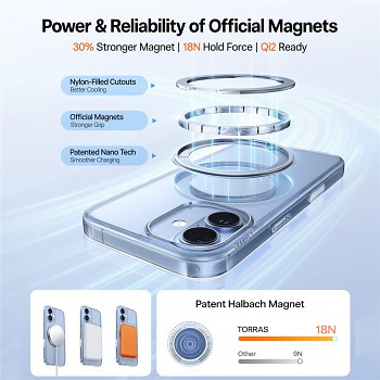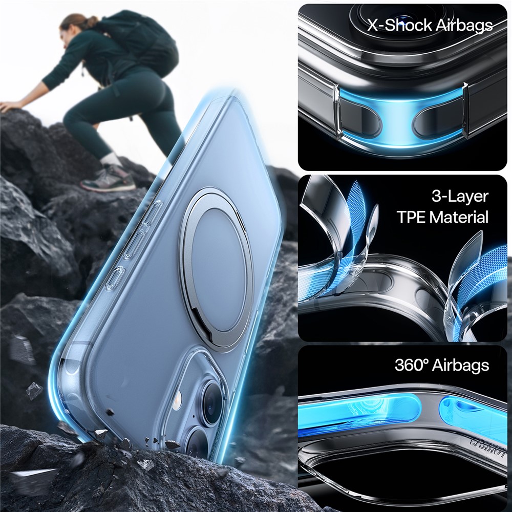 Kryt Torras Ostand Pro se pyšní křišťálově čistou průhledností, která nechá vyniknout originální barvu a design vašeho iPhone 17. Jeho klíčovou inovací je integrovaný kovový stojánek, který slouží zároveň jako praktický prstencový držák. Tento stojánek je otočný o 360° a umožňuje pohodlné sledování obsahu v horizontální i vertikální poloze, nebo pevné a bezpečné držení telefonu v ruce. Díky patentovaným magnetům Halbach nabízí kryt o 30 % silnější magnetickou sílu (18N) než běžné MagSafe kryty, což zajišťuje perfektní kompatibilitu s MagSafe příslušenstvím a bezproblémové bezdrátové nabíjení.