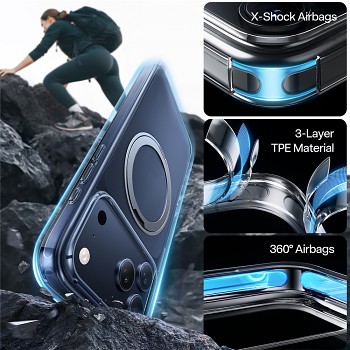 Srdcem tohoto krytu je integrovaný kroužek, který slouží jako multifunkční stojánek a bezpečný držák. Kroužek je otočný o 360°, což umožňuje pohodlné sledování obsahu v portrétním i krajinném režimu a zároveň poskytuje pevný úchop pro stabilní fotografování bez otřesů. Díky silným oficiálním magnetům a patentované technologii Halbach Magnet nabízí kryt o 30 % silnější magnetickou sílu (18N) než běžné kryty, což zaručuje perfektní kompatibilitu s MagSafe příslušenstvím a plynulejší bezdrátové nabíjení Qi2.