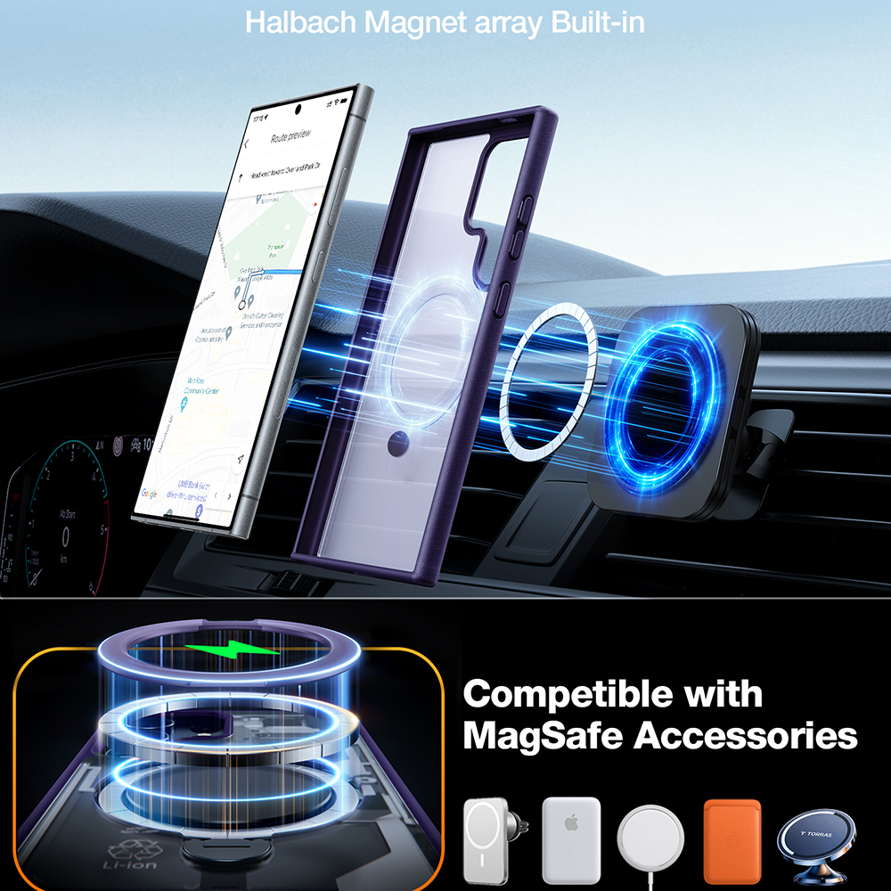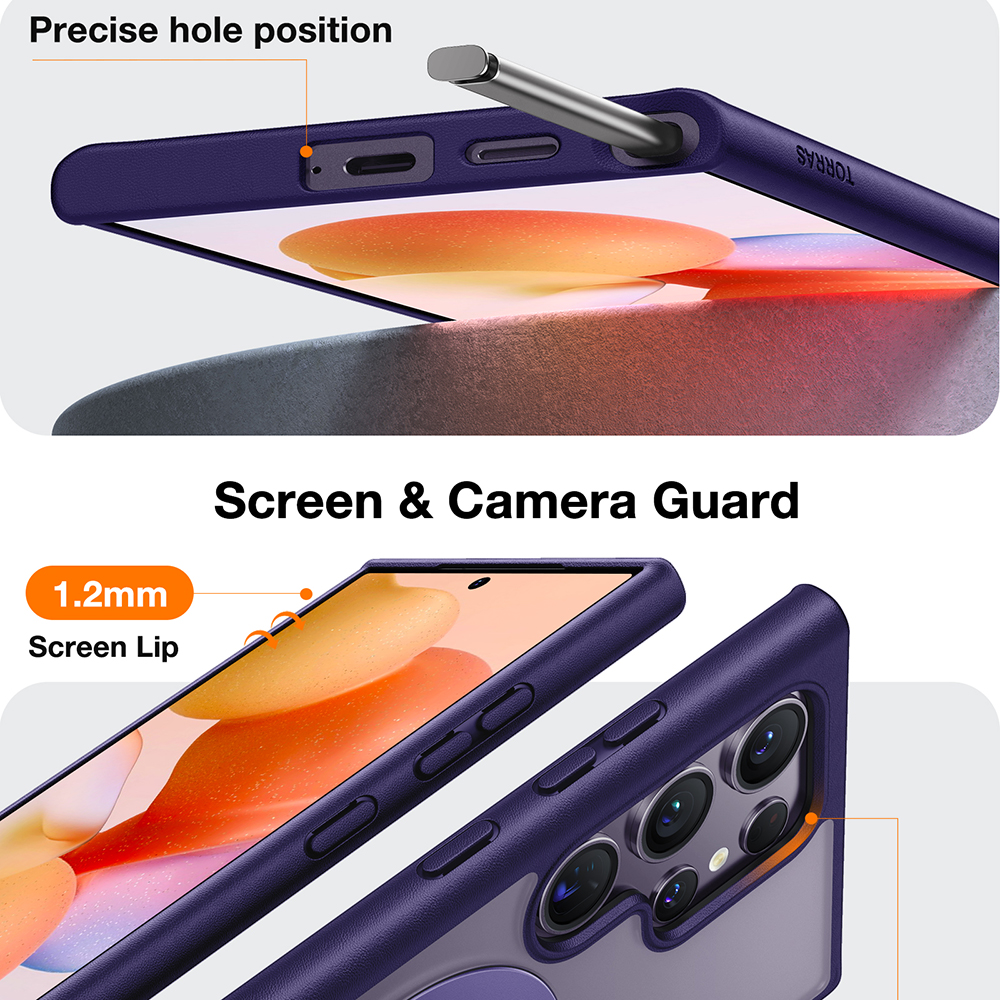 Pouzdro Torras Ostand Spin MagSafe Series se pyšní průsvitným matným zadním panelem ve fialovém odstínu, který decentně prosvítá a nechává vyniknout originální design vašeho Samsungu Galaxy S24 Ultra. Okraje krytu jsou zhotoveny z odolného fialového materiálu, který zajišťuje pevné uchopení a zvýšenou ochranu proti pádům. Klíčovým prvkem je integrovaný kroužek Ostand Spin, který je elegantně zapuštěn do zadní strany pouzdra. Tento kroužek slouží jako praktický stojánek s možností otáčení o 360°, což umožňuje pohodlné sledování obsahu v horizontální i vertikální poloze. Zároveň funguje jako bezpečný úchyt pro stabilnější držení telefonu. Pouzdro je plně kompatibilní s technologií MagSafe, což zajišťuje snadné a pevné připojení MagSafe příslušenství. Precizní výřezy pro fotoaparáty, porty a tlačítka zaručují bezproblémový přístup ke všem funkcím telefonu.