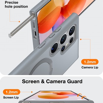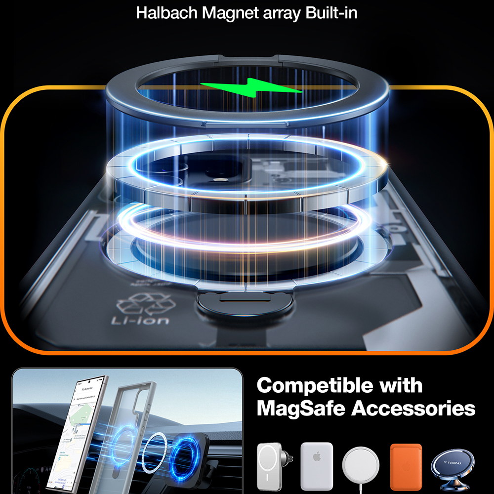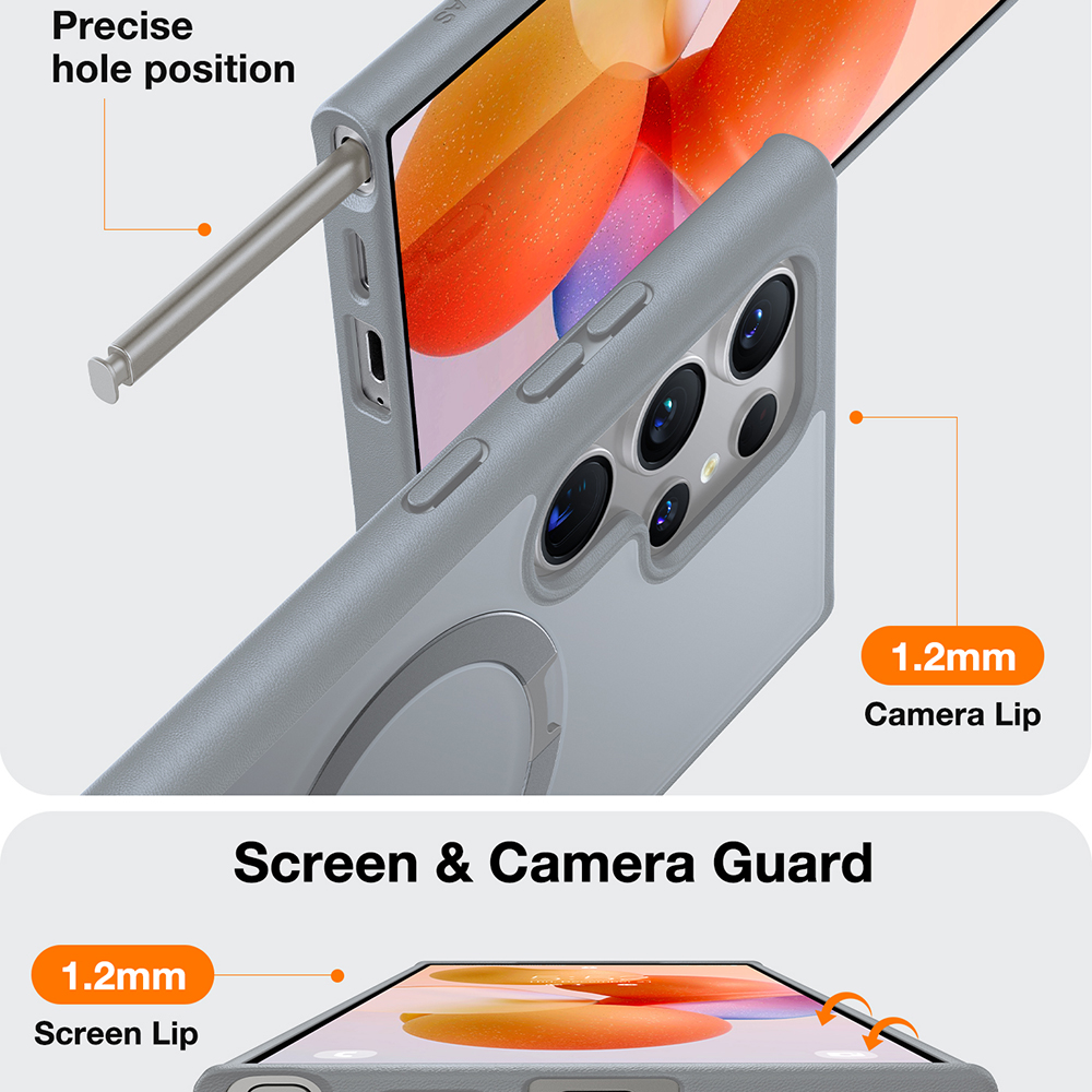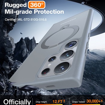 Kryt Torras Ostand Spin MagSafe Series v tmavě šedém provedení se vyznačuje poloprůhledným matným povrchem na zadní straně, který decentně odhaluje originální design vašeho telefonu, zatímco mu dodává sofistikovaný vzhled. Okraje krytu jsou v elegantní tmavě šedé barvě, která ladí s celkovým minimalistickým dojmem. Klíčovým prvkem je integrovaný otočný stojánek (Ostand Spin) z odolného kovu, který umožňuje 360° rotaci. Ten slouží nejen jako praktický stojánek pro sledování obsahu v horizontální i vertikální poloze, ale také jako bezpečný úchyt pro pohodlné držení telefonu. Díky MagSafe kompatibilitě je zajištěno pevné a stabilní připojení k MagSafe příslušenství, jako jsou nabíječky nebo peněženky. Kryt je vyroben z kombinace odolného polykarbonátu (PC) a flexibilního TPU, což zaručuje vojenskou úroveň ochrany proti pádům a nárazům. Zesílené rohy a zvýšené okraje kolem displeje a fotoaparátu poskytují dodatečnou ochranu proti poškrábání a poškození.