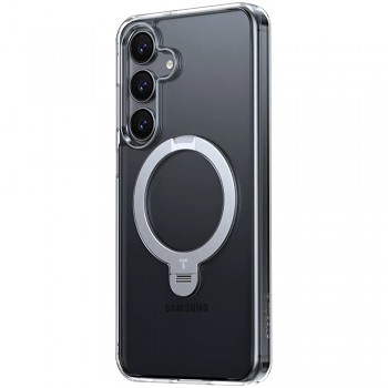 Design krytu je křišťálově čistý, což umožňuje plně vyniknout originální kráse a barvě vašeho Samsung Galaxy S25 Plus. Klíčovým prvkem je integrovaný otočný kroužek ve stříbrné barvě, který je diskrétně umístěn na zadní straně. Tento kroužek slouží jako praktický stojánek s rotací 360°, ideální pro sledování videí nebo videohovory v optimálním úhlu. Zároveň zajišťuje plnou kompatibilitu s technologií MagSafe, což umožňuje snadné a pevné přichycení k MagSafe příslušenství a bezdrátové nabíjení.