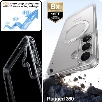 Kryt Torras Ostand Spin MagSafe Series je vyroben z prémiových materiálů, kombinujících odolný polykarbonát (PC) a flexibilní TPU z Německa, což zaručuje dlouhou životnost a spolehlivou ochranu. Díky patentované technologii X-SHOCK a 18 okolním airbagům poskytuje kryt extrémní absorpci nárazů a ochranu na vojenské úrovni (Military Grade), s certifikovanou odolností proti pádu z výšky až 12 stop (přibližně 3,6 metru). To znamená až o 40 % vyšší ochranu proti pádu. Zesílené rohy a zvýšené okraje kolem displeje a fotoaparátu chrání tyto nejzranitelnější části telefonu před poškrábáním a poškozením při pádu.