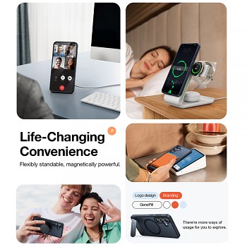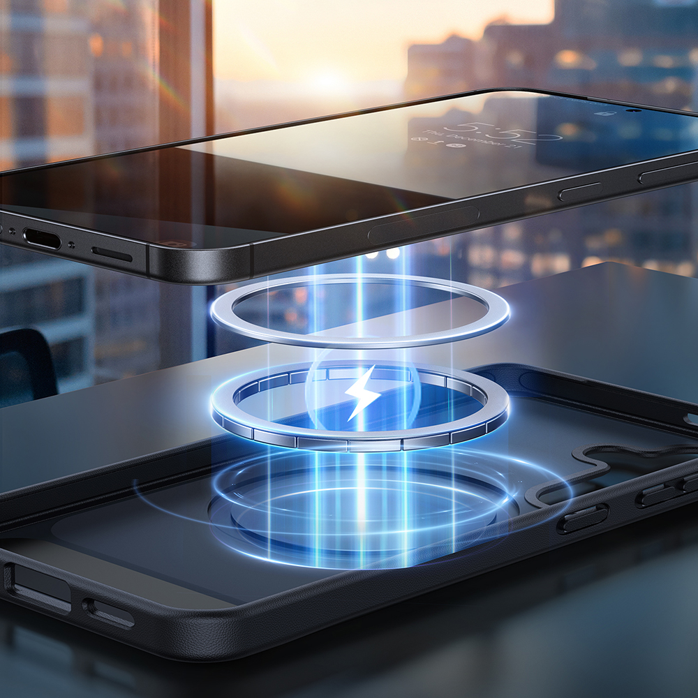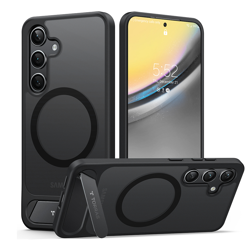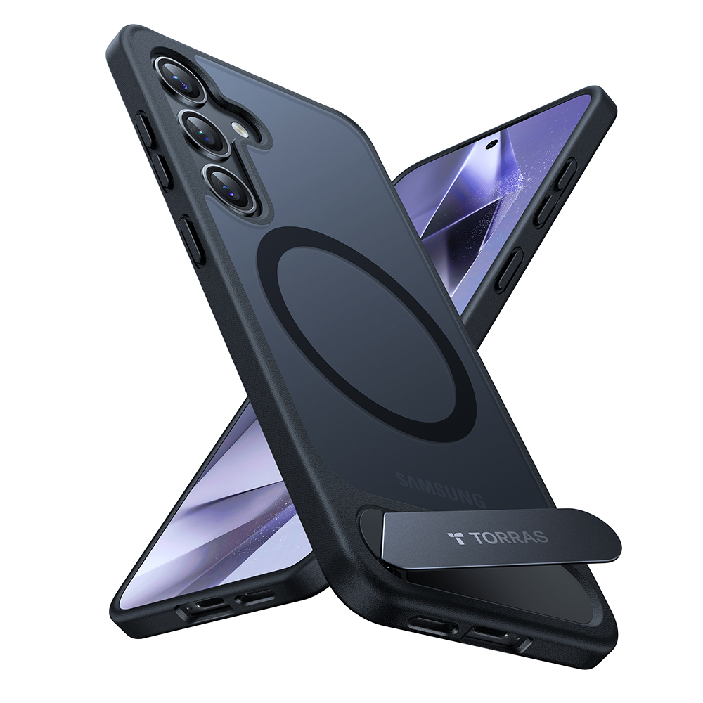 Kryt Torras Pstand MagSafe se pyšní promyšleným designem, který podtrhuje estetiku vašeho Samsungu Galaxy S24. Jeho matný, lehce průsvitný zadní panel z odolného polykarbonátu (PC) je doplněn robustním, texturovaným rámem z flexibilního TPU, což zajišťuje pohodlný úchop a prémiový vzhled. Klíčovým prvkem je diskrétní integrovaný stojánek, který je elegantně skryt v zadní části krytu a umožňuje snadné nastavení telefonu do horizontální i vertikální polohy pro sledování obsahu, videohovory nebo prohlížení webu. Na zadní straně je také viditelný integrovaný magnetický kruh, který zaručuje bezproblémovou kompatibilitu s MagSafe příslušenstvím a rychlé bezdrátové nabíjení.