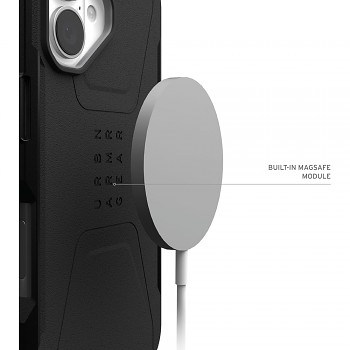 Pouzdro UAG Civilian MagSafe pro iPhone 16 se vyznačuje štíhlým a moderním profilem, který dokonale doplňuje estetiku vašeho telefonu. Jeho design je minimalistický, avšak s jasnými prvky robustnosti. Vnější strana je vyrobena z matného černého materiálu s jemnými geometrickými liniemi, které dodávají pouzdru sofistikovaný vzhled. Vertikálně embosované logo UAG decentně podtrhuje prémiový původ. Přesné výřezy pro fotoaparát a porty zajišťují plnou funkčnost, zatímco zvýšené okraje chrání displej a optiku před poškrábáním. Integrovaný MagSafe kroužek uvnitř pouzdra zaručuje bezproblémovou kompatibilitu s MagSafe příslušenstvím a rychlé bezdrátové nabíjení. Vnitřní strana pouzdra odhaluje inovativní technologii HyperCush s charakteristickým voštinovým vzorem, která efektivně rozptyluje energii nárazu a poskytuje vynikající ochranu proti pádům. Taktilní tlačítka zajišťují pohodlné ovládání.