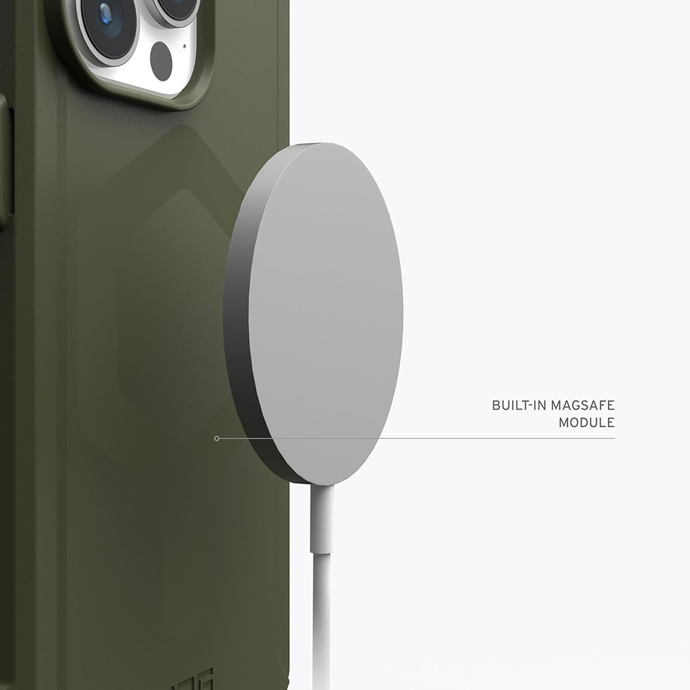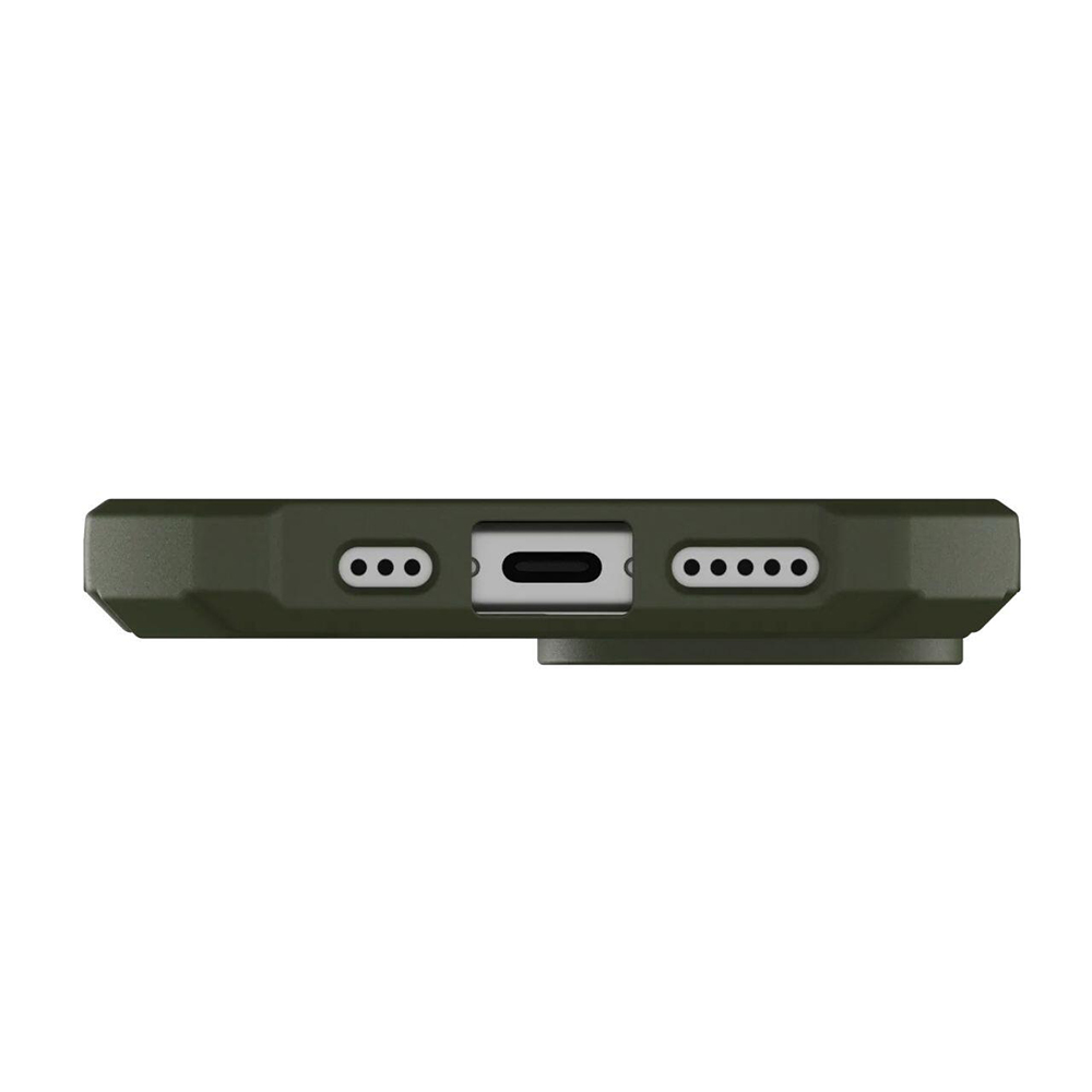 Design pouzdra je charakteristický svými ostrými liniemi a zesílenými rohy, které efektivně rozptylují energii nárazu. Zadní strana pouzdra v olivově zeleném odstínu je doplněna decentním šestihranným vzorem uprostřed, který vizuálně zvýrazňuje integrovaný MagSafe modul pro bezproblémové magnetické přichycení a nabíjení. V dolní části zadní strany je diskrétně umístěno logo UAG.