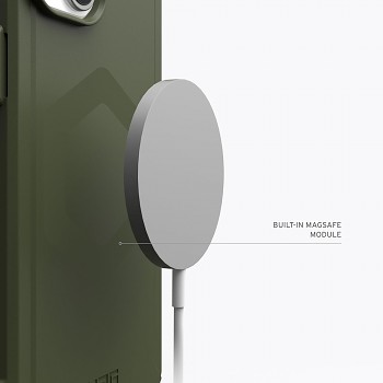 Pouzdro UAG Essential Armor MagSafe v olivově zelené barvě se vyznačuje charakteristickým industriálním designem, který je pro značku UAG typický. Jeho vzhled je inspirován outdoorovým vybavením a vojenskou technikou, což se projevuje v zesílených rozích a hranách, které poskytují dodatečnou ochranu proti pádům. Zadní strana pouzdra je hladká s decentním logem UAG ve spodní části, což dodává pouzdru moderní a čistý vzhled. Přesné výřezy pro fotoaparát a porty zajišťují plnou funkčnost, zatímco nadrozměrná hmatová tlačítka usnadňují ovládání i v rukavicích. Celkový dojem je robustní, ale zároveň elegantní, což z něj činí ideální doplněk pro každodenní použití i pro náročnější aktivity.