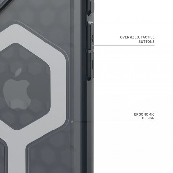 Design krytu v popelavé barvě je elegantní a funkční. Zadní strana je opatřena hexagonálním vzorem pro zvýšenou absorpci nárazů a výrazným šestihranným prvkem, který elegantně zvýrazňuje logo Apple a MagSafe modul. Zvýšené okraje kolem displeje a zvýšený rámeček kolem fotoaparátu poskytují dodatečnou ochranu proti poškrábání. Zesílené rohy efektivně rozptylují energii při pádech, zatímco nadrozměrná, hmatová tlačítka zajišťují snadné ovládání. Celkový ergonomický design a přístup k ovládání fotoaparátu podtrhují promyšlenost každého detailu.