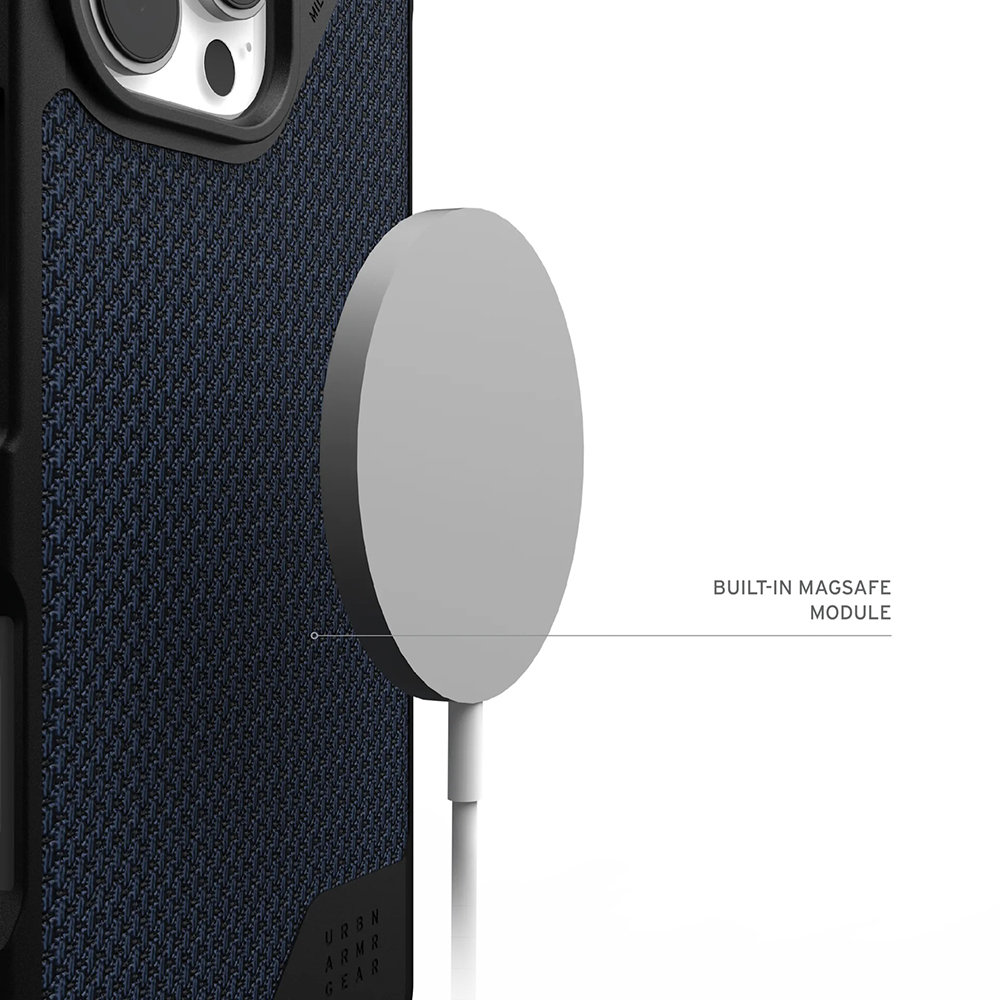Kryt Metropolis LT Magsafe je navržen tak, aby váš telefon obstál i v extrémních podmínkách. Jeho konstrukce splňuje a často i výrazně překračuje přísné vojenské normy odolnosti proti pádu (MIL-STD 810G 516.6). Základem je kombinace tvrdé vnější skořepiny a měkkého, nárazy pohlcujícího jádra, které efektivně rozptyluje energii nárazu. Zadní strana krytu je opatřena prémiovou vložkou z DuPont™ Kevlar® vláken v elegantní tmavě modré barvě, která dodává nejen sofistikovaný vzhled, ale i zvýšenou odolnost. Vnitřní strana krytu disponuje šestihranným vzorem pro zvýšenou absorpci nárazů.