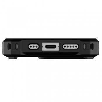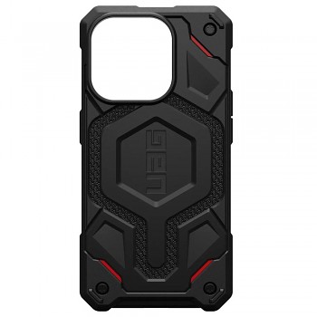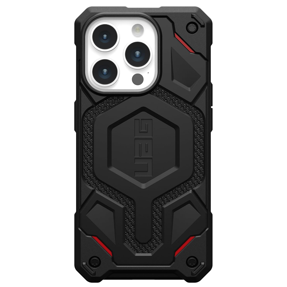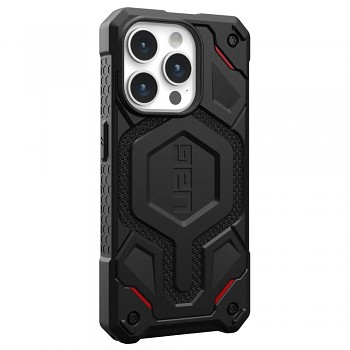 Kryt UAG Monarch Pro MagSafe se pyšní ikonickým, industriálním designem, který je okamžitě rozpoznatelný. Jeho robustní vzhled je podtržen kombinací tvrdé vnější skořepiny z polykarbonátu a měkkého, nárazy pohlcujícího jádra z TPU. Zadní strana je opatřena výraznou texturou s integrovaným logem UAG a prvky z DuPont™ Kevlaru®, které dodávají krytu nejen jedinečný vzhled, ale i zvýšenou odolnost. Černé provedení je decentně doplněno červenými akcenty, které podtrhují jeho dynamický charakter. Zesílené rohy a nadrozměrná hmatová tlačítka zajišťují maximální funkčnost a snadné ovládání, zatímco protiskluzové úchopy garantují bezpečné držení telefonu v každé situaci. Díky integrovanému modulu MagSafe je zajištěna plná kompatibilita s bezdrátovým nabíjením a MagSafe příslušenstvím.