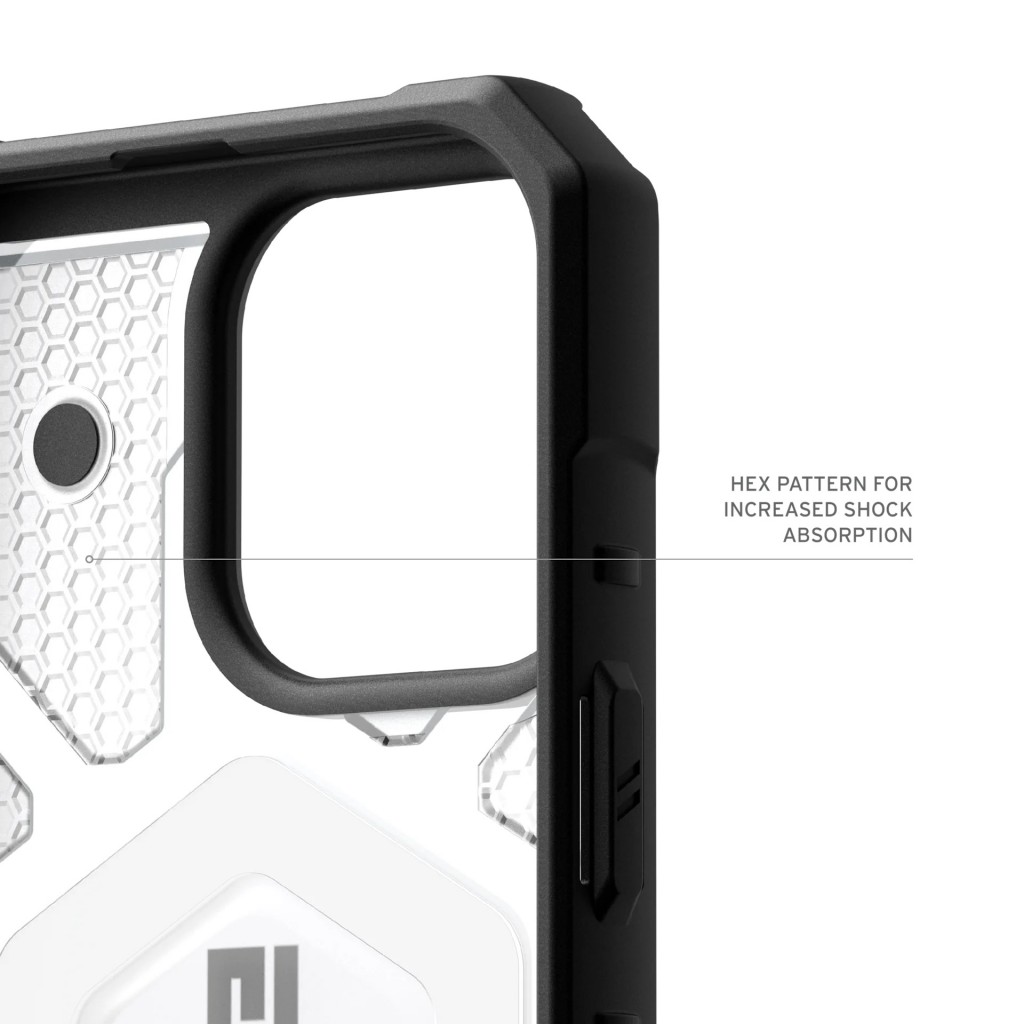 Kryt UAG Pathfinder Clear MagSafe se pyšní ikonickým industriálním designem, který je pro značku UAG typický. Jeho průhledná, ledově stříbrná zadní strana s výrazným šestiúhelníkovým vzorem nejen skvěle vypadá, ale také zvyšuje absorpci nárazů. Robustní černý rám z kompozitního materiálu doplňuje celkový vzhled a zajišťuje lehkou, ale pevnou konstrukci. Pouzdro je navíc vyrobeno z 25 % z recyklovaných materiálů, což podtrhuje závazek značky k udržitelnosti.