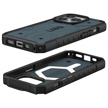 Kryt Pathfinder MagSafe v elegantní barvě Cloud Blue s černými akcenty je ztělesněním ikonického drsného designu UAG. Jeho konstrukce kombinuje tvrdou vnější skořepinu z polykarbonátu s měkkým, nárazy pohlcujícím jádrem z TPU, což zajišťuje bezkonkurenční ochranu. I přes svůj robustní vzhled je kryt překvapivě lehký a nezatěžuje váš telefon. Na zadní straně dominuje výrazné logo UAG a designové prvky připomínající šrouby, které podtrhují jeho industriální estetiku. Zvýšené okraje chrání displej a objektivy fotoaparátu před poškrábáním při položení na rovnou plochu. Nadrozměrná hmatová tlačítka a protiskluzové úchopy po stranách jsou navrženy pro maximální funkčnost a jistý úchop v každé situaci. Integrovaný MagSafe modul zajišťuje bezproblémovou kompatibilitu s MagSafe příslušenstvím a rychlé bezdrátové nabíjení.