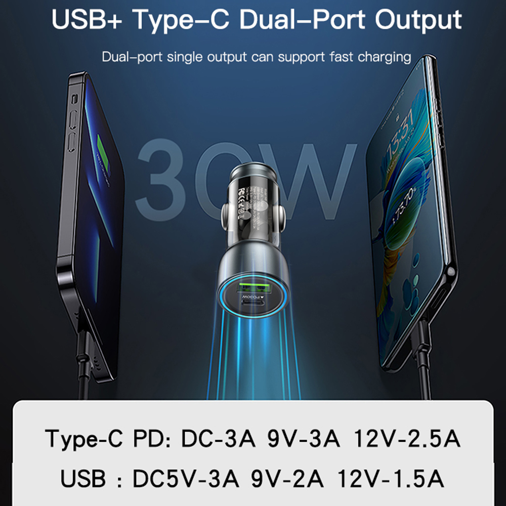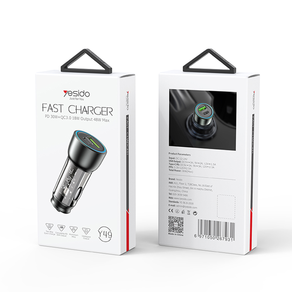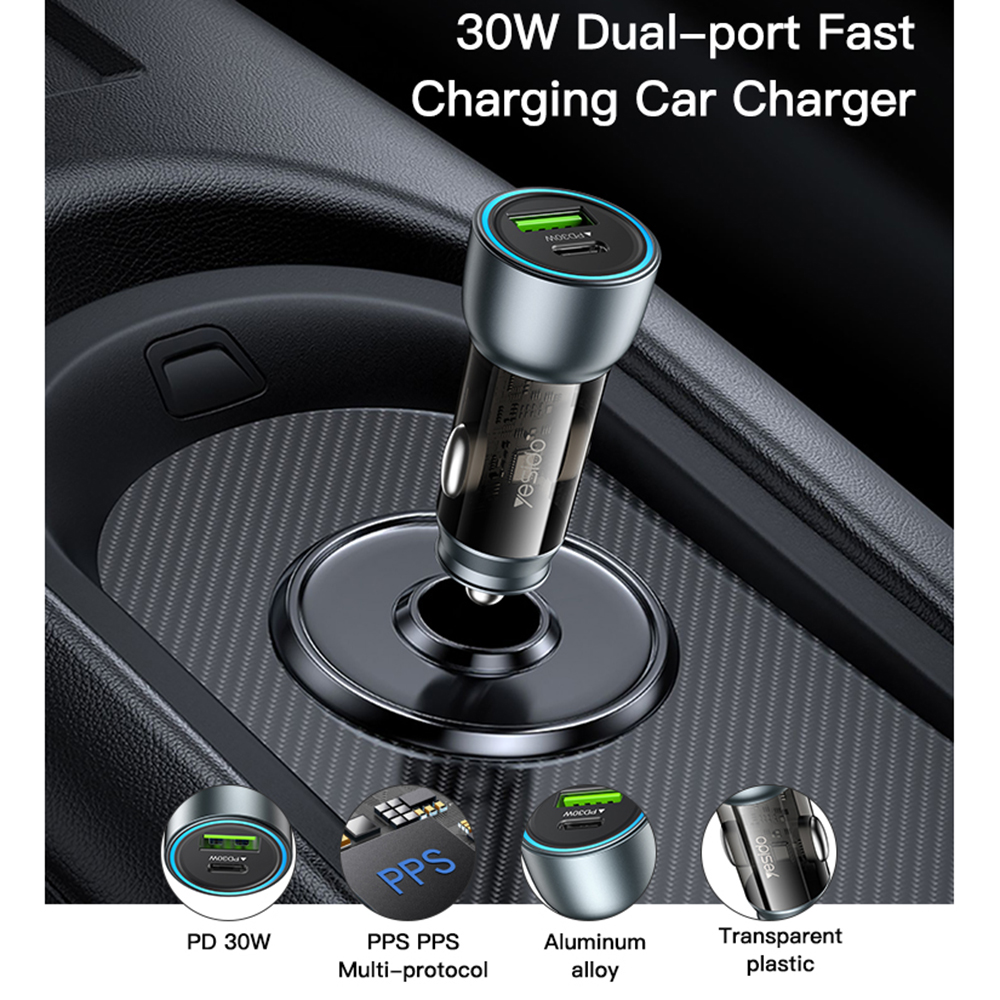 Yesido Car Charger Y49 USB-A Type-C LED světelný efekt rychlé nabíjení 30W šedáTato nabíječka je navržena s důrazem na **funkčnost a estetiku**. Její horní část v elegantní **tmavě šedé barvě** je doplněna o **průhledné tělo**, které odhaluje fascinující vnitřní obvody a logo značky Yesido. Tento **futuristický vzhled** dodává produktu jedinečný charakter. Okraj nabíječky zdobí **modrý LED světelný efekt**, který nejen signalizuje aktivitu, ale také vytváří příjemnou atmosféru v interiéru vozu.