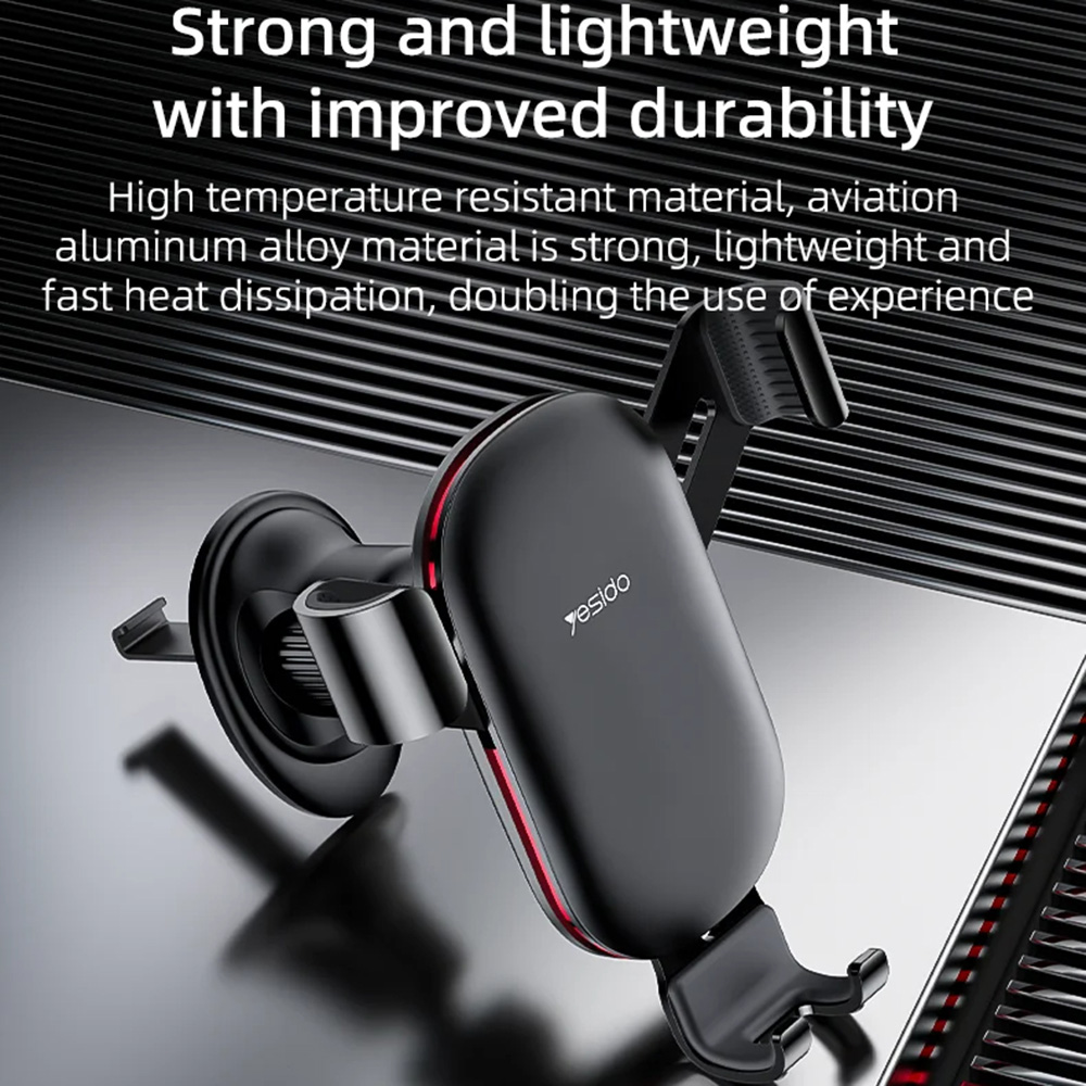 Držák Yesido C243 se pyšní moderním a minimalistickým designem v elegantní černé barvě, doplněným o decentní červené akcenty, které dodávají produktu dynamický vzhled. Jeho kompaktní rozměry a propracované linie se skvěle hodí do interiéru každého vozu. Konstrukce je vyrobena z letecké hliníkové slitiny a dalších materiálů odolných vůči vysokým teplotám, což zaručuje výjimečnou pevnost, nízkou hmotnost a dlouhou životnost. Ramena držáku, která objímají telefon, jsou opatřena měkkým polstrováním, aby nedošlo k poškrábání vašeho zařízení.