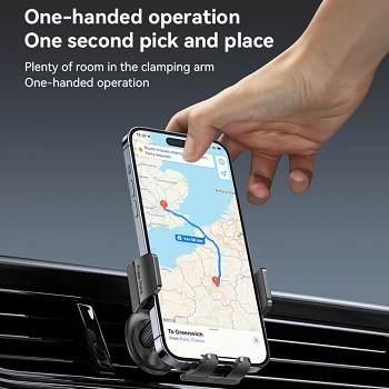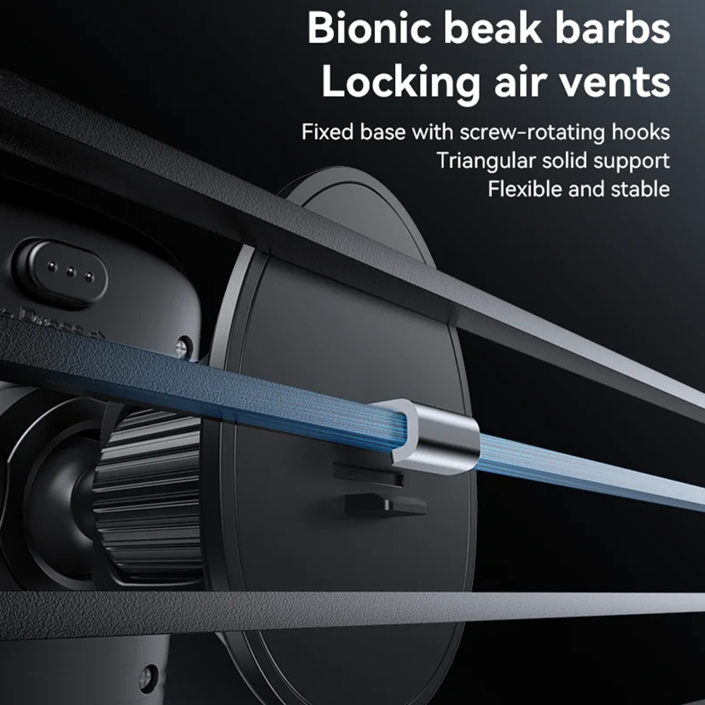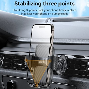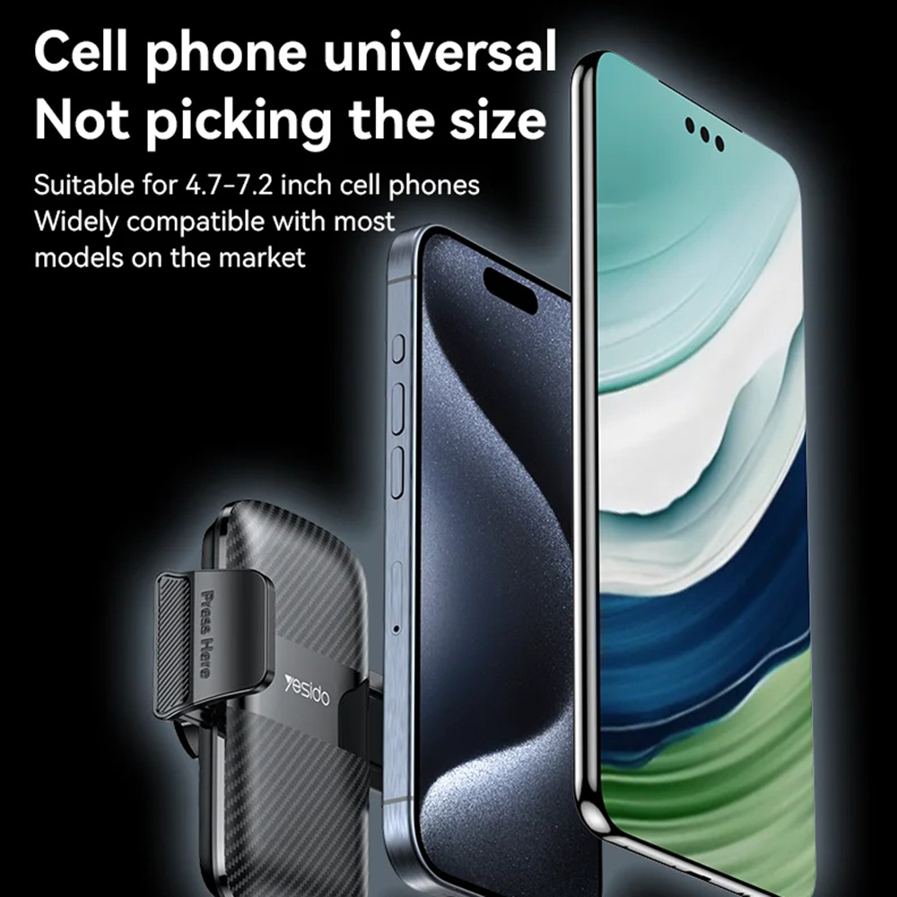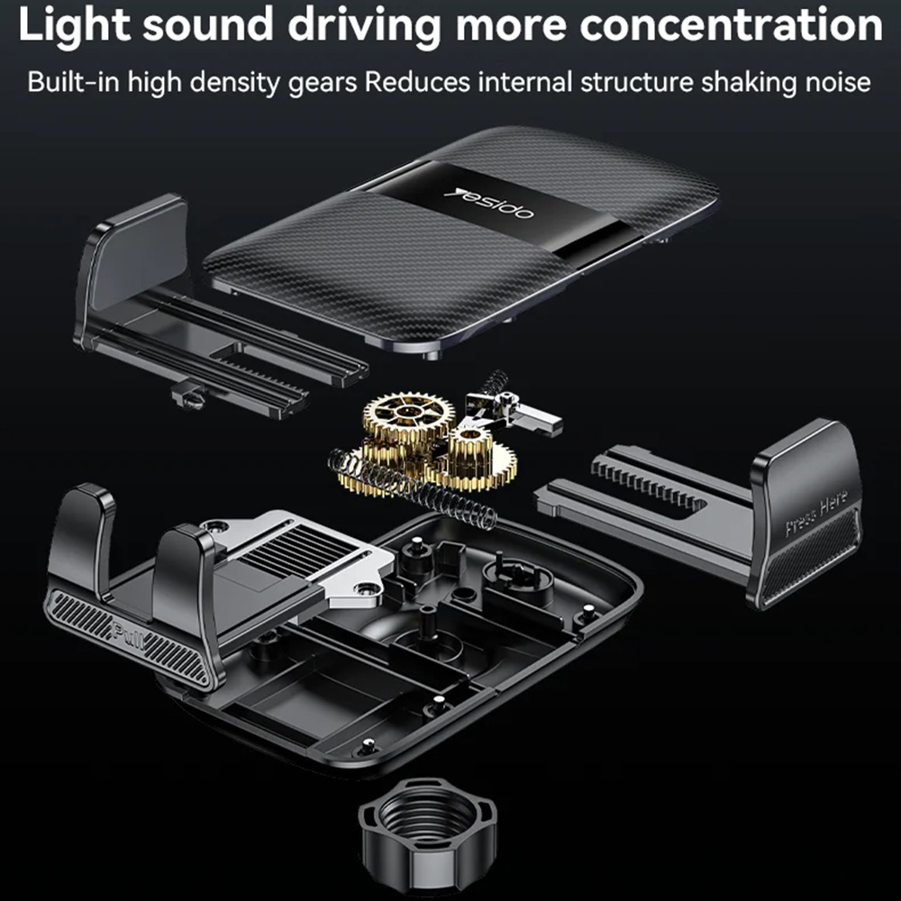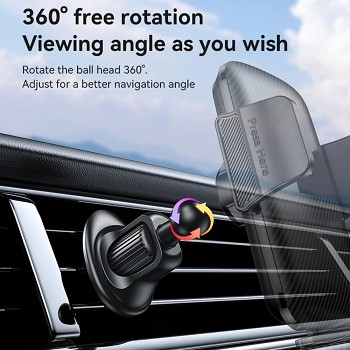 Design držáku Yesido C251 je minimalistický a moderní, s elegantní texturou karbonových vláken na zadní straně, která dokonale zapadne do interiéru každého vozu. Jeho kompaktní rozměry zajišťují, že nebude bránit ve výhledu ani narušovat estetiku palubní desky. Díky robustnímu klipu s "bionickými zobákovými ostny" a šroubovacími háčky je držák pevně a bezpečně uchycen ve ventilační mřížce, což eliminuje nežádoucí vibrace a otřesy i na nerovných cestách. Automatický zamykací mechanismus je revoluční – stačí telefon vložit a boční ramena se automaticky sevřou, čímž telefon pevně zajistí. Pro uvolnění telefonu stačí stisknout tlačítko. Držák nabízí 360° volnou rotaci, což umožňuje nastavit ideální pozorovací úhel pro navigaci. Vnitřní struktura s převody s vysokou hustotou navíc zajišťuje tichý provoz a snižuje chvění.