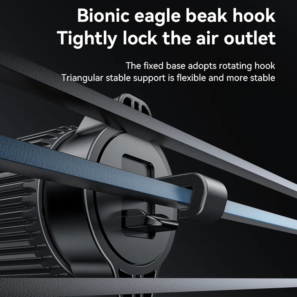 Klíčovým prvkem je inovativní upevňovací systém "Barb Lock", který je inspirován tvarem orlího zobáku a zajišťuje extrémně pevné a stabilní uchycení do mřížky ventilace. Díky otočnému háčku a trojúhelníkové stabilní podpoře se nemusíte obávat pádů ani na nerovných cestách. Magnetická plocha okamžitě a pevně absorbuje váš telefon, jakmile jej přiložíte.