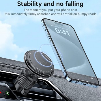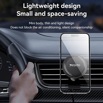 Držák Yesido C252 se pyšní lehkým a prostorově úsporným designem, který nijak neblokuje proudění vzduchu z ventilace a stává se tak diskrétním, avšak nepostradatelným společníkem. Jeho elegantní černé provedení s minimalistickým logem Yesido na magnetické ploše dokonale zapadne do interiéru každého moderního vozu.