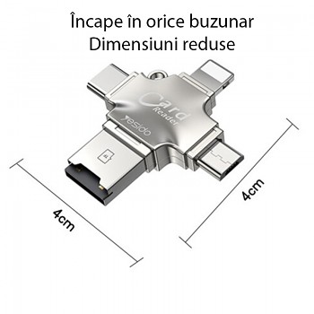 Adaptér Yesido GS13 se pyšní moderním a praktickým designem ve tvaru kříže, který je nejen vizuálně atraktivní, ale také vysoce funkční. Jeho stříbrné kovové provedení dodává produktu punc elegance a odolnosti. Díky svým kompaktním rozměrům, přibližně 4 x 4 cm (bez konektorů), se snadno vejde do každé kapsy nebo tašky, což z něj činí perfektního společníka na cesty. Na těle adaptéru je decentně vyraženo logo Yesido a nápis "Card Reader", což podtrhuje jeho prémiový vzhled.