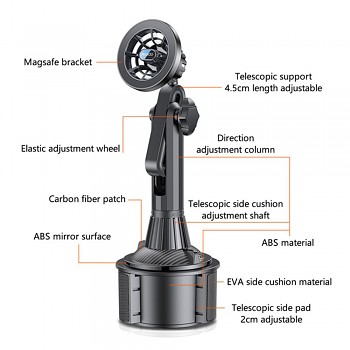 Držák Yesido C200 se pyšní sofistikovaným černým provedením, které se dokonale hodí do interiéru každého automobilu. Jeho konstrukce kombinuje odolné materiály ABS s elegantními prvky, jako je povrch z ABS zrcadla a patch z uhlíkových vláken, což mu dodává prémiový vzhled. Základna držáku je navržena pro umístění do držáku nápojů a je vybavena EVA bočním tlumicím materiálem a EVA protiskluzovými bočními polštářky, které zajišťují maximální stabilitu a ochranu proti poškrábání. Instalace je intuitivní – stačí otočit hřídelí ve směru hodinových ručiček pro vysunutí bočních polštářků a uzamčení držáku v držáku nápojů.