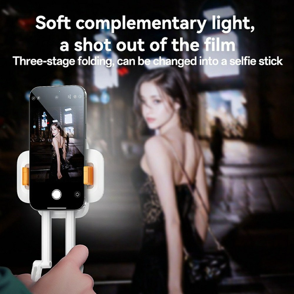 Držák Yesido DH10 se pyšní minimalistickým a moderním designem v čistě bílé barvě, doplněným o stylové oranžové akcenty na úchytech telefonu a ovládacích prvcích světla. Jeho skládací konstrukce umožňuje snadné přenášení a skladování, zatímco nastavitelné klouby zajišťují optimální úhel pohledu a osvětlení v každé situaci. Integrované doplňkové světlo je umístěno v horní části a poskytuje měkké a rovnoměrné osvětlení, které zvýrazní vaši tvář a dodá vašim fotografiím a videím profesionální vzhled.