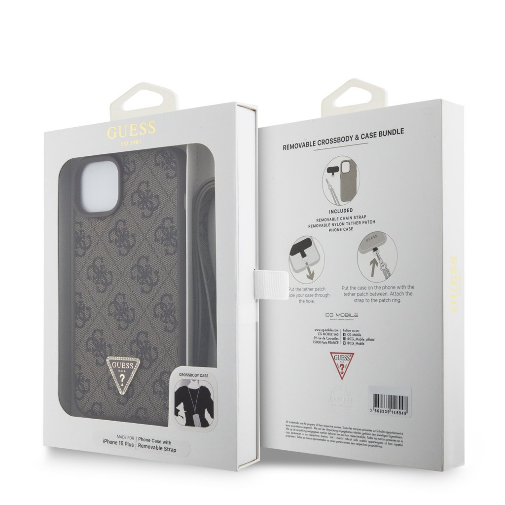 Zadní kryt a popruh Guess PU 4G Strass Triangle Metal Logo pro iPhone 15 Plus hnědýTento prémiový kryt se pyšní charakteristickým 4G vzorem doplněným o elegantní zlaté triangle logo Guess. Je vybaven stylovým univerzálním crossbody popruhem a vyniká povrchovou úpravou, která minimalizuje vyklouznutí telefonu z ruky.