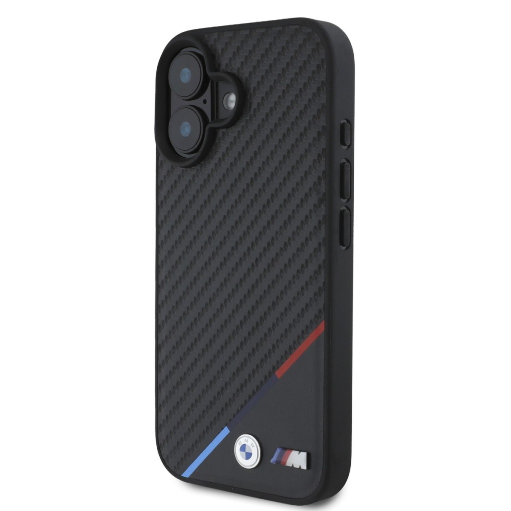 Zadní kryt BMW M PU Carbon Tricolor Stripe MagSafe pro iPhone 16 Black
