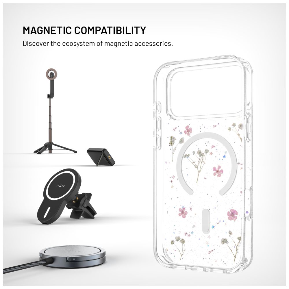 Zapomeňte na magnety, které se časem odlepí nebo vypadnou! U krytu FIXED MagBloom jsou silné MagSafe magnety integrovány přímo do těla krytu, schované mezi květinami. Díky tomu nijak nenarušují design, nevystupují a drží naprosto spolehlivě.