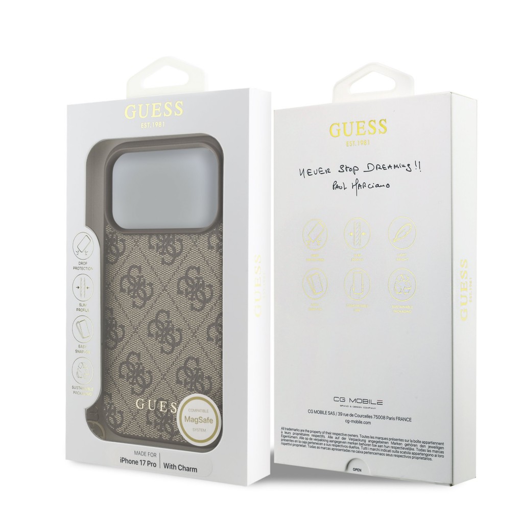 Zadní kryt Guess 4G Charm pro iPhone 17 Pro Tone on Tone BrownObjevte dokonalou kombinaci elegance a funkčnosti s prémiovým zadním krytem Guess 4G Charm pro váš iPhone 17 Pro. Tento stylový kryt je navržen tak, aby nejen chránil váš telefon, ale také mu dodal šmrnc, který zaujme na první pohled.