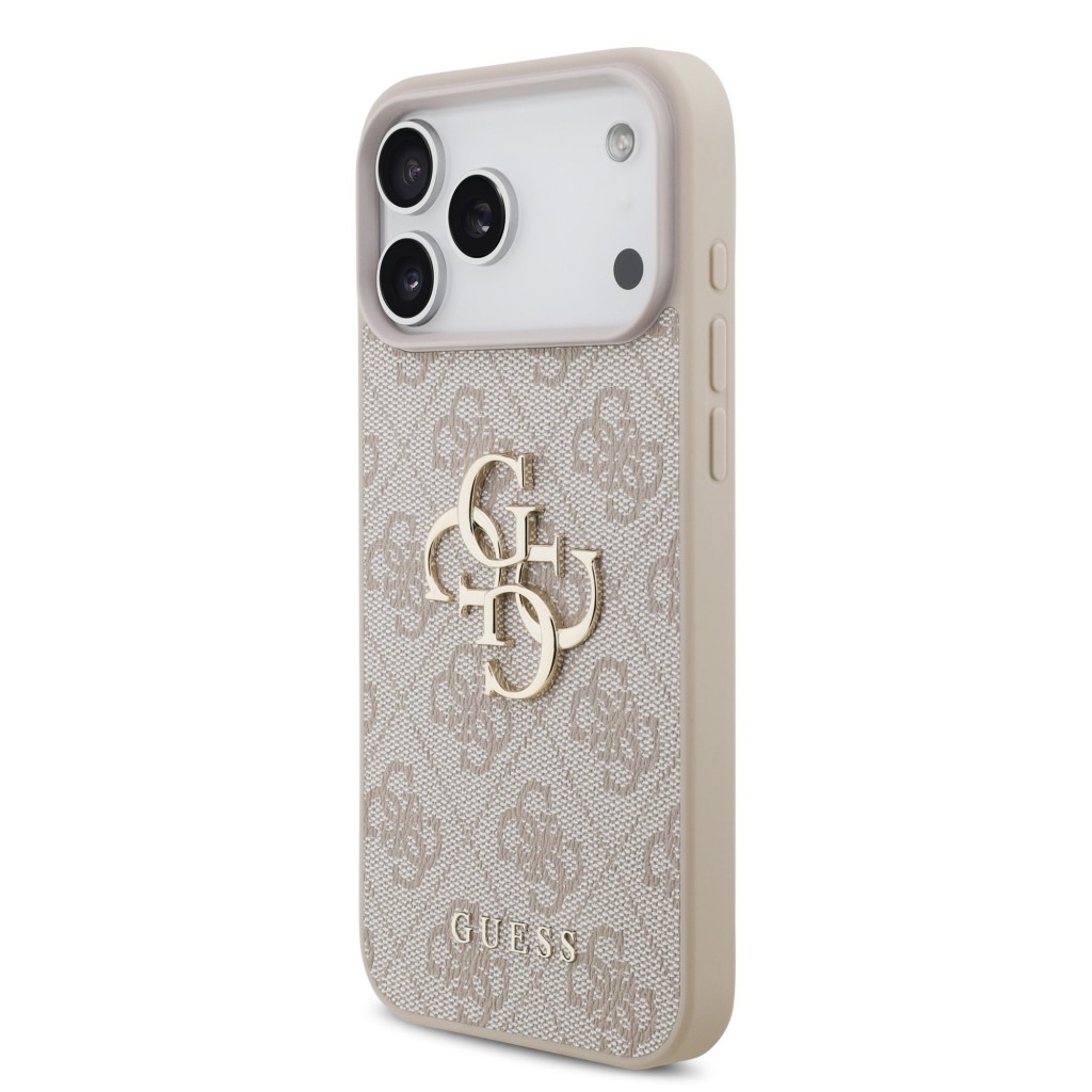 Design tohoto krytu je definován elegancí a ikonickými prvky značky Guess. Celou zadní stranu pokrývá charakteristický 4G vzor v decentním provedení, který je vytlačen do povrchu z kvalitní PU kůže. Tento povrch je nejen příjemný na dotek, ale také praktický, protože zajišťuje pevný a bezpečný úchop. Dominantním prvkem je výrazné kovové logo Guess ve zlaté barvě, umístěné ve spodní části krytu, které okamžitě přitáhne pozornost a dodává krytu punc luxusu. Kryt je precizně vytvarován, aby dokonale kopíroval křivky telefonu, přičemž plně kryje boční tlačítka a zároveň ponechává přesné výřezy pro všechny konektory a fotoaparát.