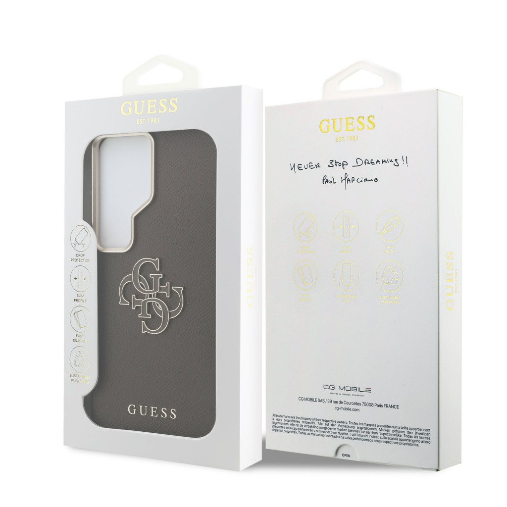 Dominantním prvkem celého krytu je masivní čtvercové logo Guess umístěné ve spodní části. Toto logo je zasazeno do elegantního kovového rámečku zlaté barvy, přičemž vnitřní část loga tvoří odolná pryskyřice (Resin). Kombinace zlatých metalických prvků a hnědé textury vytváří harmonický celek, který působí luxusně a zároveň decentně. Boky krytu jsou vyrobeny z pružného a pevného materiálu, který přesně kopíruje křivky telefonu Samsung Galaxy S26 Ultra a zajišťuje jeho bezpečné usazení.