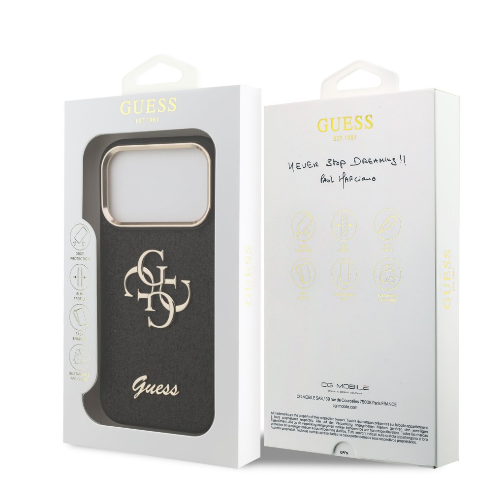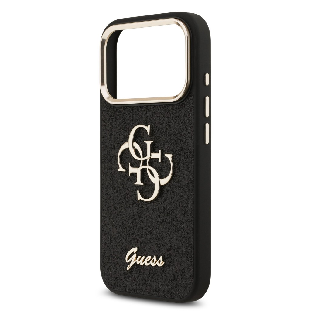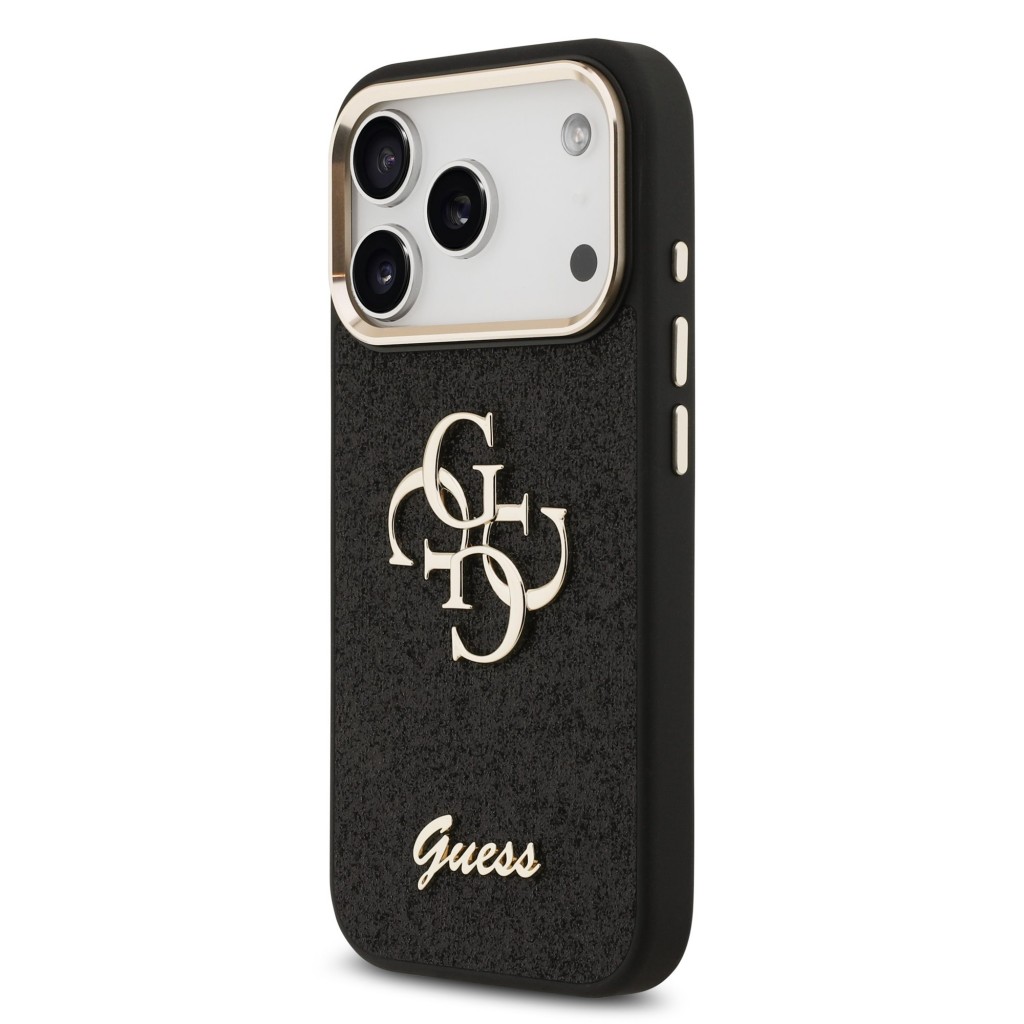 Zadní kryt Guess PU Fixed Glitter 4G Metal Frame pro iPhone 17 Pro černýČerný luxusní vzhled podtržený třpytkami a dominantním kovovým 4G logem Guess.