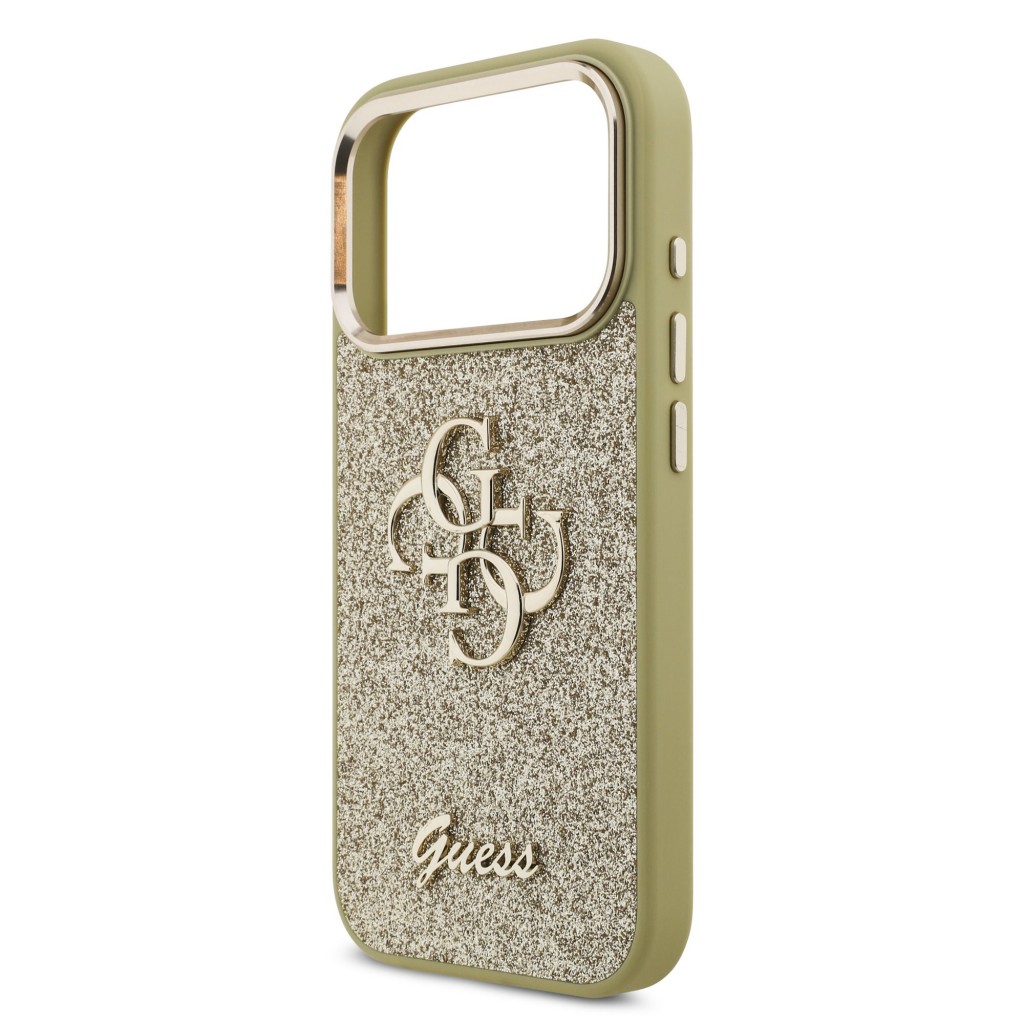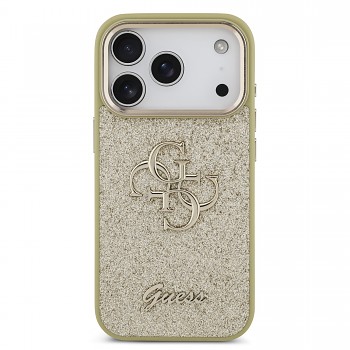 Zadní kryt Guess PU Fixed Glitter 4G Metal Frame pro iPhone 17 Pro zlatýZlatavé provedení s integrovanými třpytkami a elegantním kovovým 4G logem uprostřed.