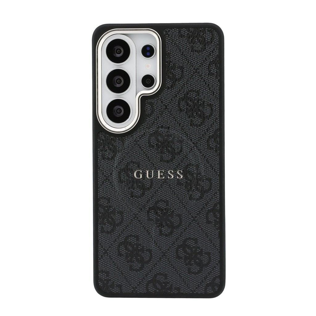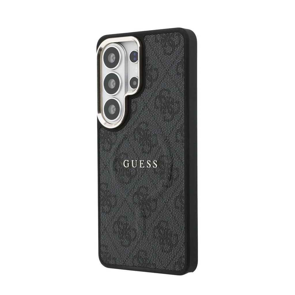 Design krytu je tvořen s důrazem na detail, který je pro značku Guess typický. Povrch je potažen **vysoce kvalitní PU umělou kůží**, která je na dotek velmi příjemná a dodává telefonu luxusní texturu. Celou plochu zadní strany pokrývá **ikonický potisk se vzorem 4G**, který je synonymem pro eleganci této značky. Dominantním estetickým i funkčním prvkem je **integrovaný magnetický kroužek**, který je barevně sladěn s celkovým konceptem krytu a tvoří moderní kontrast k textuře kůže. V dolní části zadní strany se nachází **vystouplé kovové logo Guess**, které potvrzuje autentičnost a prémiový původ produktu. Hrany krytu jsou přesně tvarované, aby kopírovaly křivky telefonu, a zajišťují tak štíhlý profil celého zařízení.