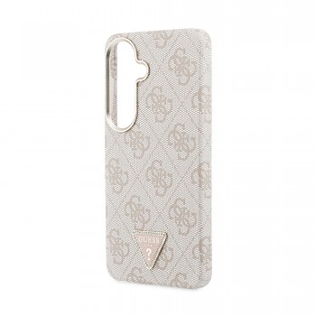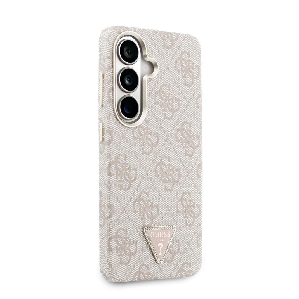 Design tohoto krytu je navržen s důrazem na detail a eleganci, která je pro značku Guess typická. Povrch je potažen kvalitní **PU umělou kůží** s jemnou texturou, kterou zdobí ikonický celoplošný potisk **Guess 4G**. Centrálním prvkem zadní strany je luxusní kovové **trojúhelníkové logo**, které je v tomto modelu navíc osázeno třpytivými kamínky (**Strass**). Kryt se pyšní exkluzivním **zlatým lemováním** (Gold Frame) nejen kolem obvodu, ale i v oblasti výřezu pro fotoaparát, což vytváří sofistikovaný kontrast k růžovému podkladu. Konstrukce je navržena tak, aby byla co nejtenčí a zachovala přirozené linie telefonu, přičemž povrchová úprava zajišťuje bezpečný a pohodlný úchop, čímž předchází nechtěnému vyklouznutí z ruky.