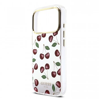 Design tohoto krytu je zaměřen na detail a eleganci. Základem je průhledný nebo jemně tónovaný TPU materiál, ve kterém jsou rozptýleny drobné třpytivé částečky (glitry). Ty při dopadu světla vytvářejí oslnivý efekt, který dodává telefonu hloubku a šmrnc. Dominantním prvkem zadní strany je hravý a stylový motiv třešní (Cherry pattern). Červené plody třešní s kontrastními zelenými lístky jsou precizně vyobrazeny po celé ploše krytu. Uprostřed zadní části se nachází integrovaný magnetický kroužek pro technologii MagSafe, který je vkusně zakomponován tak, aby nenarušoval celkovou estetiku. Ve spodní části krytu nesmí chybět ikonické logo Guess, které potvrzuje autenticitu a prestiž tohoto produktu.
