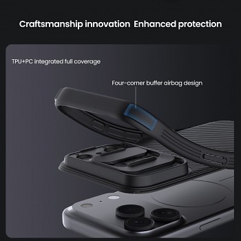 Nillkin CamShield PRO se odlišuje od běžných krytů díky svému posuvnému krytu čočky fotoaparátu, který chrání objektiv před poškrábáním a prachem. Záda krytu jsou vyrobena z pevného a odolného plastu, zatímco rámeček je z měkčeného TPU plastu, což zajišťuje maximální ochranu okrajů a rohů vašeho zařízení.