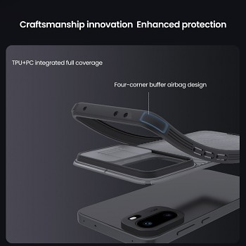 Kryt se pyšní propracovaným designem, který kombinuje pevnost a pružnost. Záda krytu jsou vyrobena z pevného a odolného polykarbonátu (PC), který efektivně chrání telefon před poškrábáním a nárazy. Na zadní straně naleznete unikátní posuvný kryt, který bezpečně zakryje čočku fotoaparátu a chrání ji před poškozením a nečistotami. Rámeček krytu je vyroben z měkčeného a flexibilního TPU plastu, který skvěle tlumí pády a usnadňuje nasazování i sundávání krytu. Povrch krytu má jemnou texturu, která je příjemná na dotek, zabraňuje ulpívání otisků prstů a zajišťuje jistý úchop. Všechny výřezy pro konektory a ovládací prvky jsou precizně zpracovány pro pohodlné používání telefonu.
