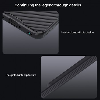 Kryt Nillkin CamShield PRO se pyšní propracovaným designem, který je funkční i stylový. Záda krytu jsou vyrobena z pevného a odolného polykarbonátu (PC), který zdobí jemná diagonální textura. Tato textura nejenže skvěle vypadá, ale také zabraňuje ulpívání otisků prstů a mastnoty a zajišťuje jistější úchop. Rámeček krytu je vyroben z měkčeného a pružného TPU plastu, který dokonale pohlcuje nárazy při pádech a chrání tak nejzranitelnější části telefonu – jeho rohy a hrany. Dominantním prvkem je precizně zpracovaný posuvný kryt fotoaparátu, který se lehkým pohybem zasune a odhalí čočky pouze tehdy, když je potřebujete. Všechny výřezy pro konektory a ovládací prvky jsou naprosto přesné a nebrání pohodlnému používání telefonu.