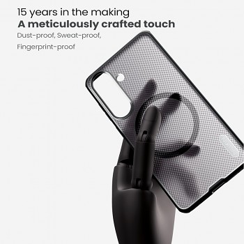 Design krytu je založen na hybridní technologii dvou materiálů, které zajišťují maximální odolnost. Zadní část je vyrobena z pevného a extrémně odolného polykarbonátu, který tvoří pevnou kostru celého pouzdra. Povrch zadní strany zdobí typická jemná matná textura, která je příjemná na dotek, nezanechává otisky prstů a zajišťuje, že telefon v ruce neklouže ani při náročném používání. Boky krytu jsou tvořeny měkkým a pružným TPU materiálem. Tento přechod mezi tvrdými zády a měkkými boky je navržen tak, aby tlumil nárazy při pádech na hrany. Design dále doplňují zesílené rohy, které fungují jako deformační zóny. Přesné výřezy pro fotoaparát, tlačítka a nabíjecí konektory jsou samozřejmostí, přičemž tlačítka jsou chráněna hmatovými prvky pro snadný stisk. Uvnitř konstrukce je integrován silný magnet, který nenarušuje profil krytu a zůstává zcela skryt.