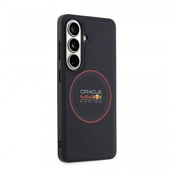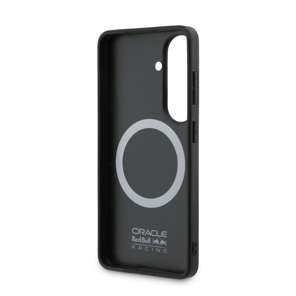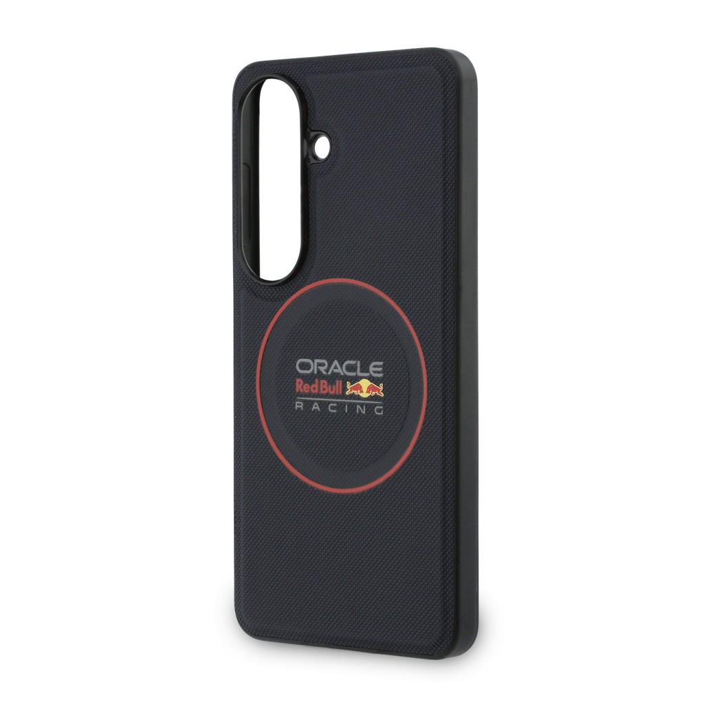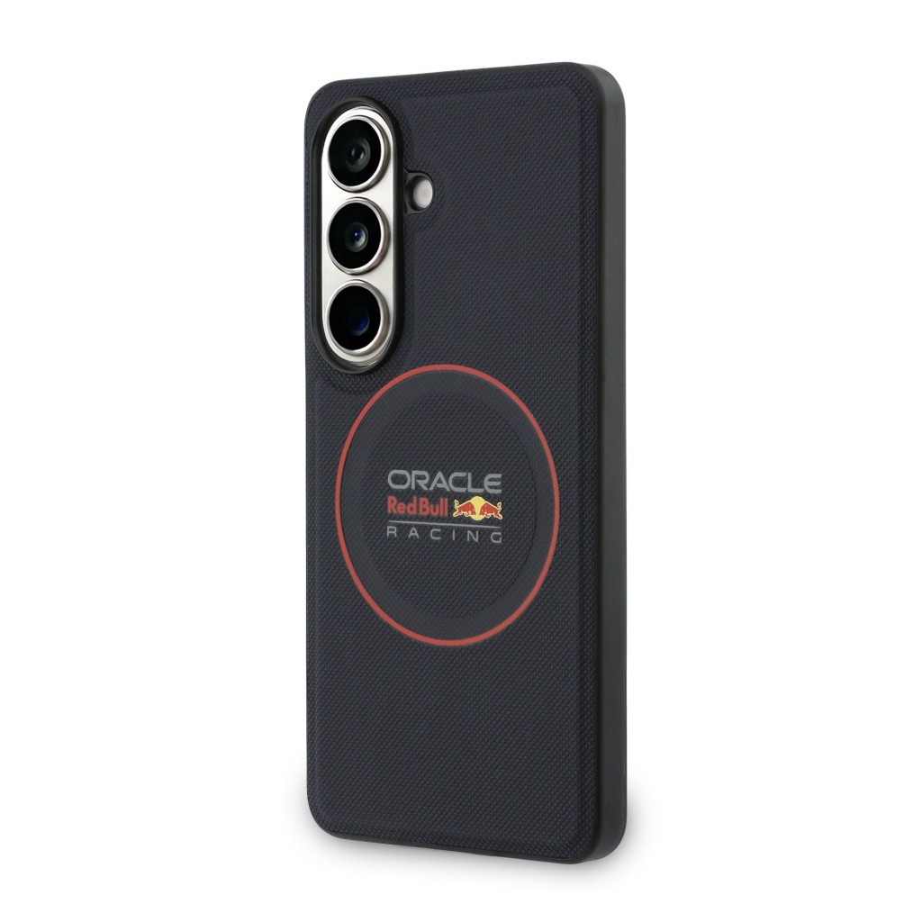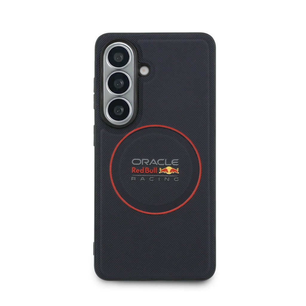 Design tohoto krytu je mistrovským dílem, které kombinuje sportovní estetiku s luxusními materiály. Zadní strana je potažena kvalitní eko kůží s unikátní perforovanou texturou (meshed), která připomíná prodyšné materiály používané v kokpitech závodních vozů. Tato struktura zajišťuje nejen moderní vzhled, ale také jistý a bezpečný úchop, díky kterému telefon nevyklouzne z ruky. Dominantním prvkem je výrazný červený prstenec umístěný ve středu krytu. Ten ohraničuje integrovaný magnet a zároveň vizuálně zdůrazňuje ikonické logo Oracle Red Bull Racing, které se nachází ve spodní části. Boky krytu jsou vyrobeny z pružného TPU materiálu, který plynule navazuje na pevnou zadní část a zajišťuje ochranu hran při nárazech. Celkový vzhled je dotažen k dokonalosti precizním lícováním všech výřezů a elegantním tmavým provedením s kontrastními červenými detaily.